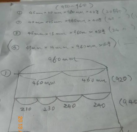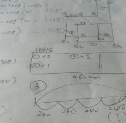 今朝、それらの材料で、何脚つくれるかを計算してみます。暗算だけでは心もとなく、紙に書いてみます。効率的な「木取り」を考えて、最大20脚のようです。この値は、①を基準にしたものです。
