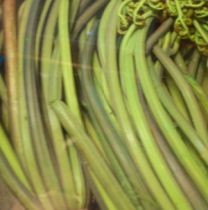 知人から「ワラビ(蕨)」をいただきます。茹(ゆ)で方も教えていただきます。「木灰(もくばい)」を使う方法です。「木灰」を入れた熱湯に浸すだけの簡単な方法です。結果は、緑のワラビに仕上がります。