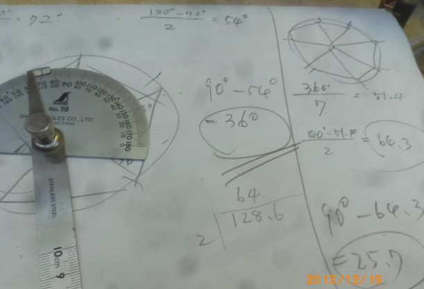 七角形は、90°-(180°-360°/7)/2で、25.7°あたりだったようです。勿論、アバウトの世界です。