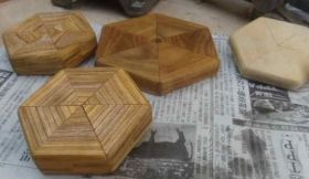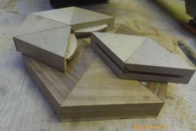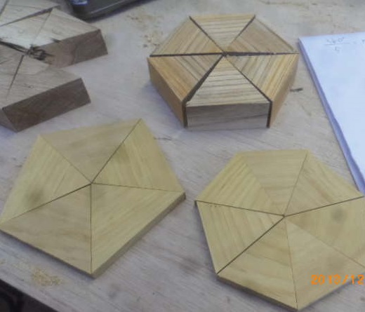 今日は、ジョイナーを使った工作をその他にもします。正三角形を6枚合わせで正6角形をつくることです。これによって、板の木口(こぐち)を外に出さないことができます。少し面白そうなのです。