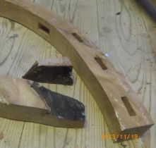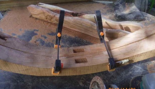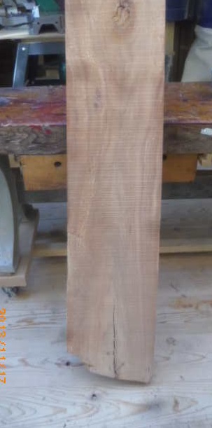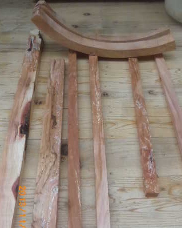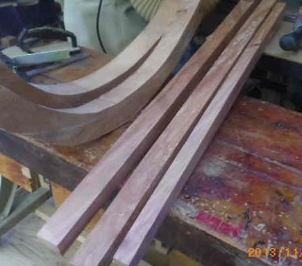 今日の材料はプラムです。数年前、近くの庭のものを伐り、W製材所で1寸5分ほどに製材してもらったものです。多少の勿体無さはありますが使うことにします。まず、畳に触れる「弓」です。そしてフレーム材のつくりです。