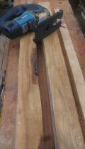 ツールは、弓の曲線も垂木(たるき)の直線加工もジグソーに頼ります。使い方の幼稚さからか、2枚の刃を折ります。いつもながらパワフルなツールです。