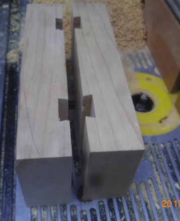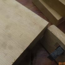 構造は、上下2枚の板を2本の束(つか)?でまとめるものです。昨日は、その接(は)ぎを「ホゾ組み」にします。糊(のり)を付けなくてもビシーッと固定されています。今日は、「蟻組み」を考えます。正式?には、「蟻組み接ぎ」、「蟻組み継ぎ」というようです。お互いの反(そ)りを止め合う仕掛けです。また、接着力は強力です。デザイン的にも面白いのです。