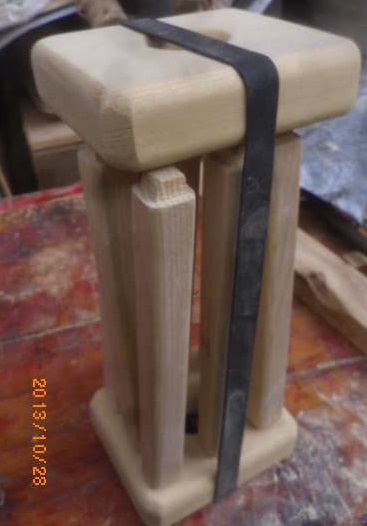 考えた末、辿(たど)り着いた先がゴムチューブです。終始、全体に、一定の力を加えながら、1ヶ所ずつ納めていく方法です。それぞれのホゾとホゾ孔が対応したことを確認して、コンコンと金槌(かなづち)で叩いてやります。ほぼ一瞬で解決します。