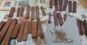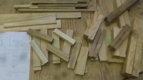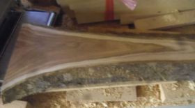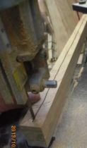 皮つきの材からイスの脚を採ろうとしています。プレナーに数十回通すと、厚さ30mmほどになります。その後、耳を取り除きます。
