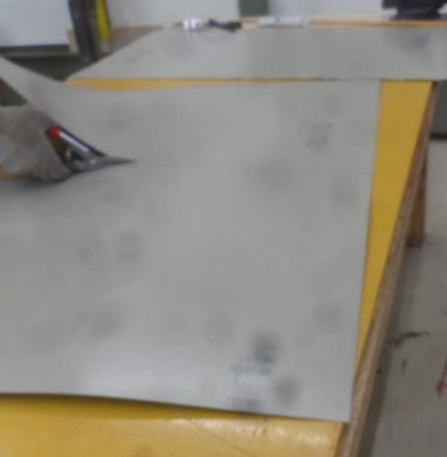 結局、つくることにします。額をつくる要領で良さそうです。ホームセンターでカラートタンと、裏板用のベニヤ板を求めます。それらを4分割してもらいます。