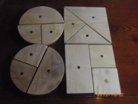 プレナーで分(厚さ)を揃えます。そして、直線はスライド丸鋸(のこ)で、円はバンドソーとベルトサンダーでつくります。今回は、単に、様子を覗うだけです。このようなパズルの場合は、抽象的で単純な形が良さそうです。
