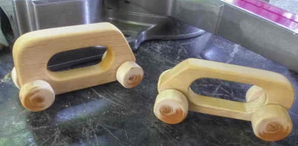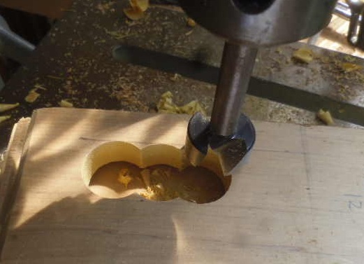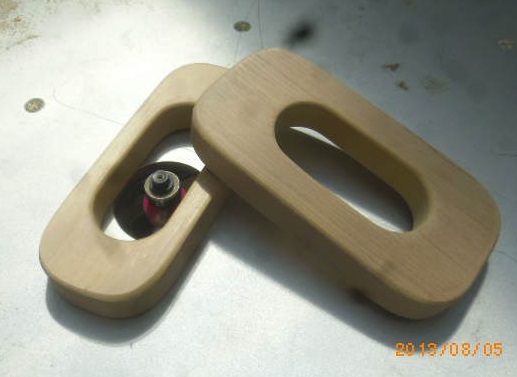 「フォスナービット」で3ヶ所を刳(く)り貫き、鑿(のみ)で整えるだけです。そしてサンダーをかけます。あとは、本体に、車軸が通る孔をあけて組立てるだけです。この段階では、前後の区別の無い形です。