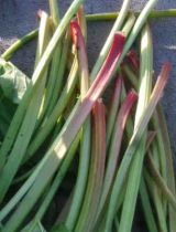刈り取られたルバーブがズラリと並んでいます。これがジャムになります。蕗(フキ)のような葉を削除し、刻んだ茎(くき)を煮(に)て、砂糖を入れ、煮詰めるだけです。