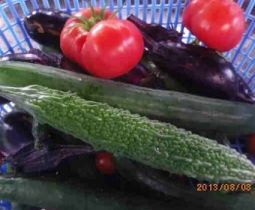 早朝、畑の水遣りと収穫です。毎日収穫しているのはトマト、キュウリ、ナス等です。しかし、今朝は、ゴーヤも採ります。初めての収穫です。パセリが茂っています。1mほどにもなる、と聞いているオクラはまだ1尺ほどの丈ですが、次々に花をつけています。