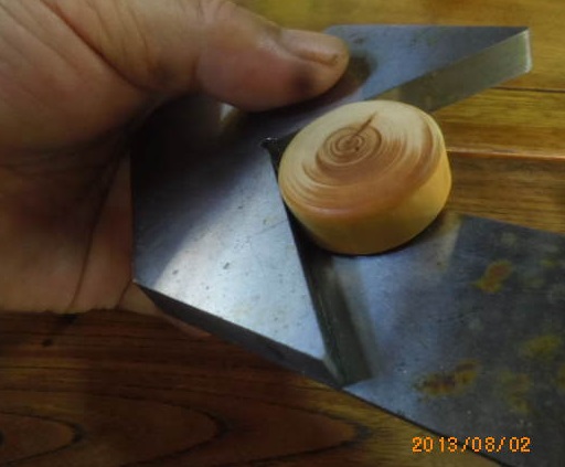 サンダーを使って丁寧に剥(む)き直します。それをスライド丸鋸(まるのこ)でカットしてみます。驚きます。わずか500玉大の枝の木口に40~60本の年輪です。1mmの間に数本もあります。これだけでもじっと眺めていたくなります。
