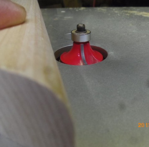その面取り(稜角の鈍角化)からです。トリマーに「坊主面ビット」を装着して削るだけです。仕事は電気がしてくれます。短時間で終えます。