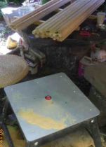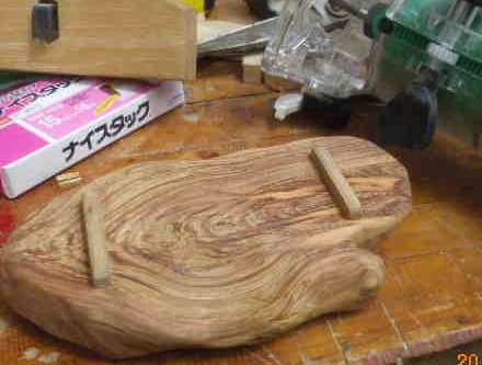 台に脚(あし)をつけることにします。ほんの4mmほどの高さの脚です。この取付けは、トリマーで溝を掘り、別の材を埋め込む方法にします。