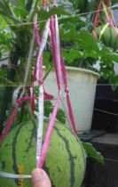 スイカは、成長の進捗(しんちょく)の確認です。小玉は、丸いボールが生まれてから30日後が食べ頃です。大きくなっているものが実をつけたデートは6月27日です。あと1週間ほどが適期のようです。因みに、大玉は40日といわれています。