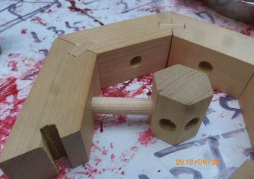 とはいうものの、釈然としないものがあります。夕刻、第2作目をつくってみます。材料は、1作目の1/4ほどの太さにし、また、内径も、心持小さくしてみます。そして、スポークを「竹籤(たけひご)」にしてみます。オール青森ヒバにはならない恨みはありますが、ま、考え方としてはありそうです。