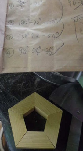 5角形を考えるのは中学校以来です。手持ちの「スライド丸鋸(まるのこ)」に関係する角度を計算してみます。まず、360°÷5=72°、180°-72°=108°です。結局、正5角形の内角の1角は108°です。