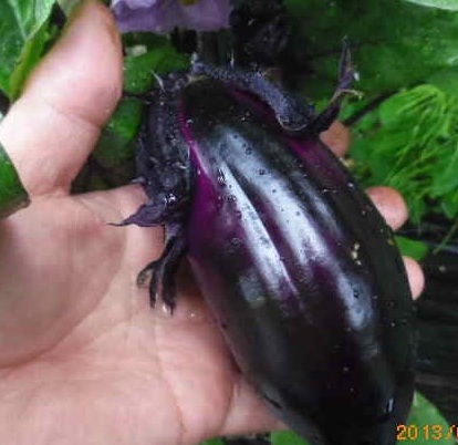 小さい、とはいうものの、大きいものは手のひら大もあります。朝食時、早速、「ナス焼き」になります。このレシピは、皮のまま焼き、冷水にとり、焦げた皮を取り除くだけです。鰹節をかけて生姜醤油でいただきます。小ぶりのものは、塩揉み(しおもみ)していただきます。