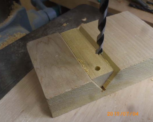 車軸部分も正三角形にします。それぞれの3面に直角にドリルを揉み込むには、やはり、ジグに頼らざるを得ないようです。とはいうものの、使ったジグは、正三角柱を切り出したときに出来たものです。ジグは、初めから目の前にあったのです。