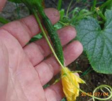 他方、キュウリの収穫は未だです。窺がうと、爪楊枝(つまようじ)大が生っています。感激すること頻り(しきり)です。ゴーヤの黄色い花が咲いています。しかし、どうやら、雄花(おばな)のようです。カボチャ、スイカ、キウイと同様のようです。