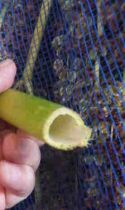 風通しの良い日陰に、「タマネギ」の大きな袋に10袋ほども吊るしています。茎(くき)はジャムやサラダになりますが、種を育てた主茎は、空洞になっています。そして、木のように硬いです。