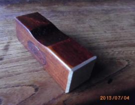 「拭漆青森檜葉箸置(ふきうるしあおもりひばのはしおき)」を1個だけカットしてみます。そして両木口(こぐち)の8辺の面取りをします。漆の面と白木の面との対比がややどぎつくもあります。