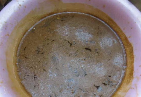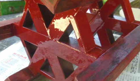 すると、シューッと音を立てながら赤い水が出てきます。一瞬、これが弁柄(紅殻・べんがら)か、と、納得します。酸化鉄顔料の色です。洗面器半分ほどにもなります。