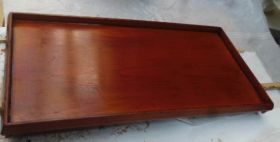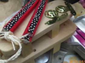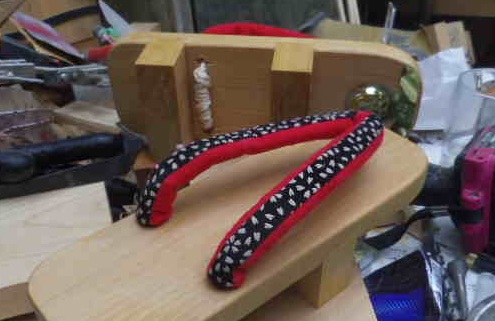 早朝の沐浴前に「下駄(げた)」の「鼻緒挿げ(はなおすげ)」をします。昨日塗った「木固めエース」でザラザラになっています。サッとサンダーをかけてやることでスベスベになります。