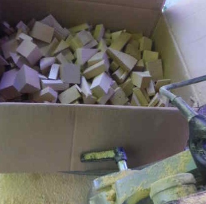 まず、掃除です。床には細かい端材が敷かれています。丸鋸(まるのこ)でカットされたものです。埃(ほこり)は、ベルトサンダーによる微粉末、そして、丸鋸からの大鋸屑です。
