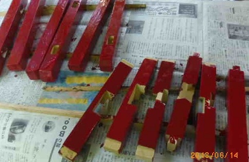 それも、まだホゾ加工前のものでした。だとすれば、組立と塗りは、塗りの方が先だったことになります。詰将棋と同じように、仮に正しい手順があるとすれば、今回の「糸巻づくり」で、それが明らかになるかも知れません。
