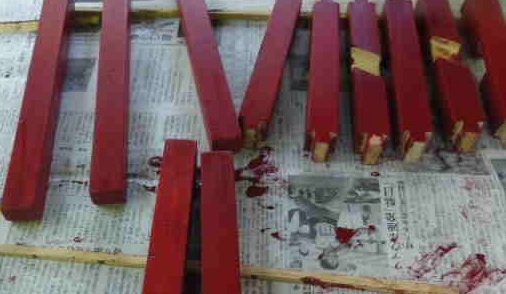 一回目の塗りは、木地にタップリと浸み込ませたいところです。朱漆にテレピン油を若干混ぜて撹拌します。それを無垢の木地に擦り込んでやります。組立の際に隠れる部分には極力漆を付けないようにします。