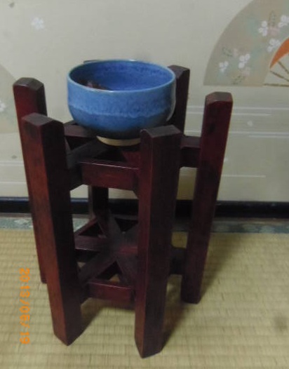 昼食後、その輪ゴムを外してみます。全体的には、まあまあの出来です。そして、上段に茶碗を載せてみます。数種類を試みた結果、ブルー系が良さそうです。剣山を使って茶花なんぞを活けてみたくなります。