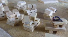 端材を探して、作業に入ります。使ったツールは、手押し鉋(かんな)、丸鋸(まるのこ)、プレナー、トリマー、アジャスタブルフェンス、ノギス、曲尺、等です。トリマーにはスパイラルビットを装填します。そして、最も優先する哲学は、早く、正確な作品をつることです。瞬く間に11足分の部材の完成です。台が22、歯が44ということになります。歯の厚さは台と同じ6mmです。押し込むとビシーッと挿し込まれます。