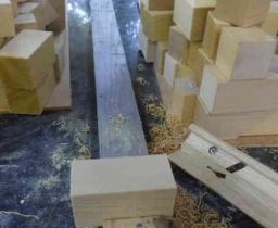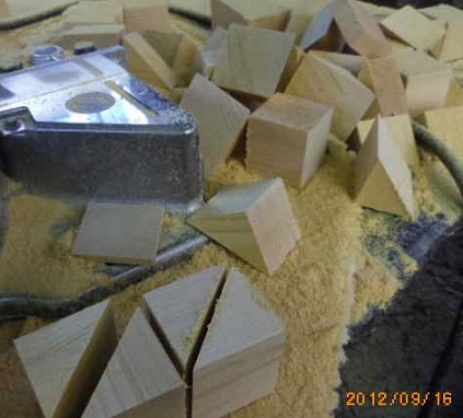 今日は積木のカットの様子見です。カット面がそのまま結果となるデリケートな加工です。試運転のつもりでした。木口は見事な切り口です。鉋(かんな)をかけた木端面よりも滑らかです。