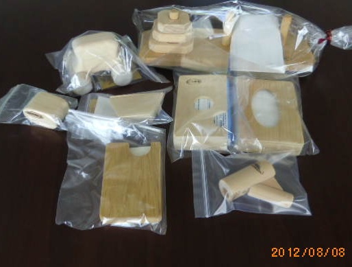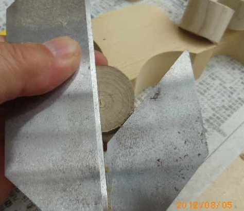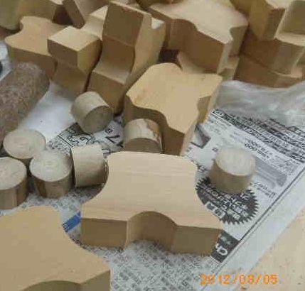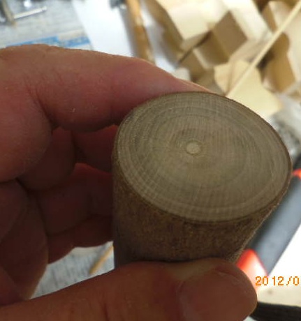 実は、これまで試したのは数種類です。青森ヒバのタルキ(垂木)を丸棒に削り、それをカットしたもの、出来あいの丸棒(アメリカヒバ)を使ったもの等です。何れも一長一短です。