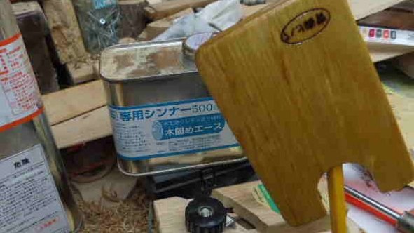 葛藤の末、結局、コーティングすることにします。塗料は「木固めエース」です。舐めても良い、とされる透明なウレタン系です。お気に入りのひとつです。実は、この塗りは今朝で3回目です。これまでの2回は夜の作業でした。朝の光でよく見ると、非常に粗末な出来になっています。
