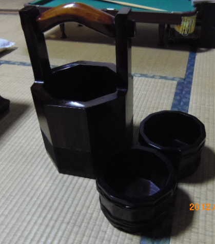 一方は手桶(ておけ)を真似たものです。飾り箍(かざりたが)には布、手はイチイ(一位)の枝をつかっています。他方、小さい桶は、一升瓶の袴(はかま)をイメージしています。こちらのタガ(箍)はトヨシ(籐葦)です。いずれも拭き漆仕上げです。