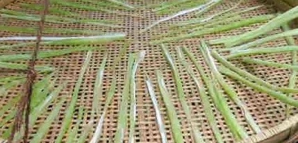 一部を薄くスライスして水に晒します。そのままでは結構な硬さです。サッと塩茹(ゆ)でして漬けるのだそうです。明朝が楽しみです。僅か4本の茎です。それを干すものと漬物に分けます。ママゴトのような作業です。