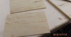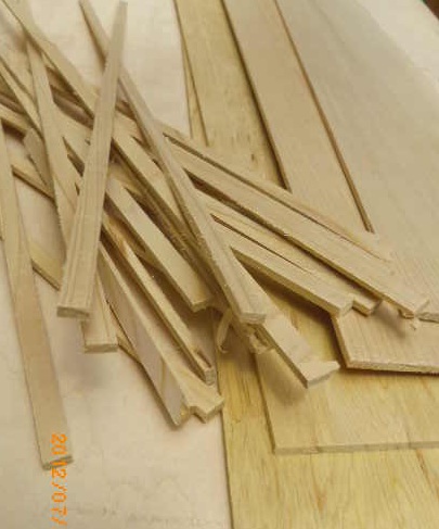 材料は薄い「青森ヒバ」です。以前、Y製材所から、分合わせで出た、厚さ3mmほどの板をいただいています。それを丸鋸、テーブルソーで希望する幅にカットし、プレナー(自動鉋)で整えます。