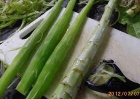 つい先般、茎(くき)を食べることを知ります。ピューラー(PEEL)を使います。茎の表皮は白っぽく結構硬いものです。しかし、内部は柔らかく瑞々しく緑色です。勿論、新発見です。