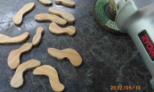 材料を、薄いケヤキ(欅)にします。まず鋸(のこぎり)で大雑把にカットします。その後、ディスクグラインダーで形を整えます。当然のように、仕上がる10個それぞれの形は、それぞれ異なっています。それでも、何となくトンボに見えなくもないです。その程度で十分なのです。