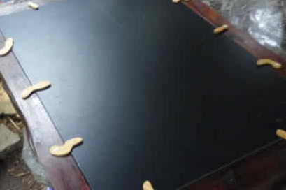 今朝は、その「槐」の「額縁(がくぶち)」に手をかけることにします。「額づくり」は簡単な作業ですが、それなりの過程を踏むことになります。まず、「留め」の補強からです。実際の補強はL字金具で終えています。しかし、この仕掛けは表面に見えないものです。そのことが少し不安です。