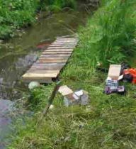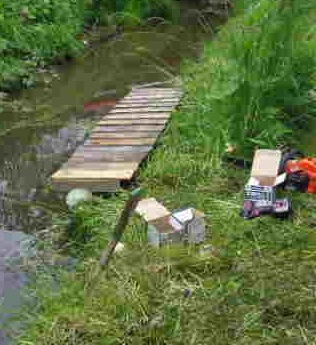 午前中、川に手をかけます。鯉(こい)の隠れ家です。実は、10年以上も前から、2尺大の緋鯉と真鯉が住み着いています。17~8匹もいます。しかし、水嵩(みずかさ)が低いことから、カラスに背中を突っつかれます。そのための避難所です。