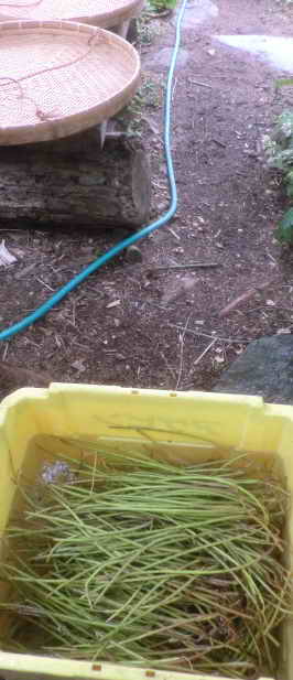 いただいたキササゲは剪定(せんてい)で出たものです。洗った後、笊(ざる)に入れて廊下に吊るします。時間をかけての陰干しです。
