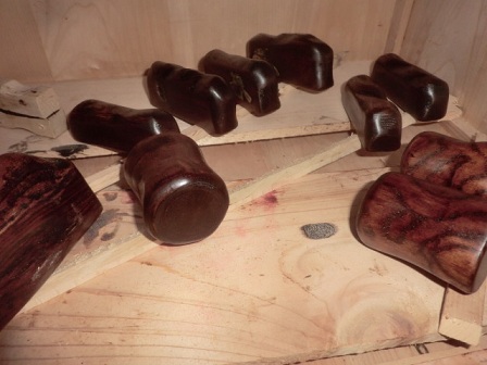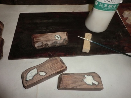 このところ続けてきた「文鎮(ぶんちん)づくり」に今日も手を掛けます。木地と貝の隙間の手当てです。昨日に続いて今日も穴埋めです。よく解かりませんが、この工程は「目地調整」の部類に入るようです。