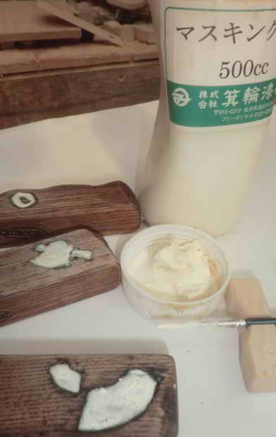 最近手をつけたのは1週間前です。貝と木地を「糊漆(のりうるし)」で接着させました。その乾きを待っているところでした。