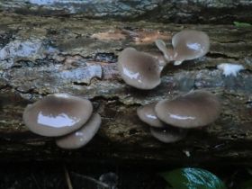 また、切り株についているキノコを見て『カワラダケですよ。』、と訴えます。屋根の瓦(かわら)に似ていることから命名されたそうです。『サルノコシカケ(猿の腰掛)の数倍の抗癌(がん)力があります。』、と解説します。
