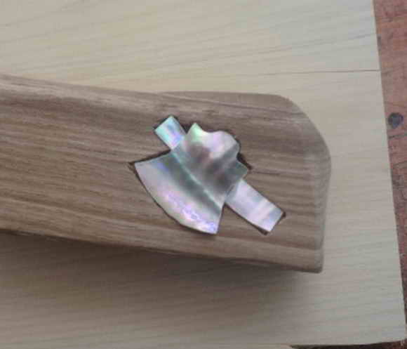 「嵌入」というのは溝に貝を「嵌(はめ) 入れる」ことです。勿論、wordで変換できない言葉です。一般的でない、知る人ぞ知る言葉です。その言葉を使うとき、何となく職人になった錯覚に陥るほどです。さて、「扇」と「鉞(まさかり)」はそれらしく見えます。しかし、「鍔(つば)」が少し苦しいです。文鎮(ぶんちん)に「刀の鍔」の図案です。それに加えて拙(つたな)い加工です。一般的には理解されないことが考えられます。