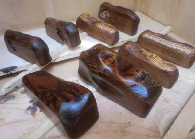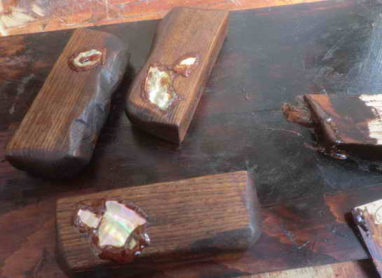 「工房事情」・・・和みの演出短時間ですが、今日も木工活動を楽しみます。このところ手がけているペーパーウェイトです。昨日、接着剤で割ったものの復元をしています。