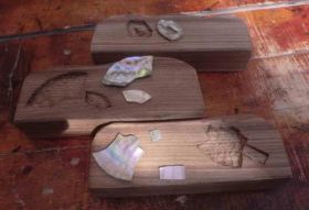 装飾に「螺鈿(らでん)」を使います。その基本的な準備も終えています。今日は「嵌入(かんにゅう)」です。これは彫った木地に象であるアワビ貝を嵌め込む作業です。