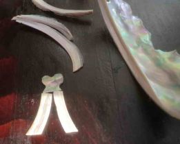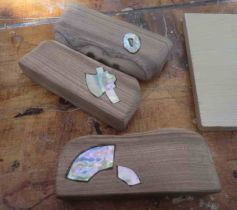 「螺鈿(らでん)」の練習も兼ねています。「象嵌(ぞうがん)」の材料は「アワビ(鮑)」です。昨日、嵌め込む貝をカットしています。「扇」、「鉞(まさかり)」、「鍔(つば)」です。拙い(つたない)出来ではあるものの、懐かしさとともに不思議な面白味が感じられます。